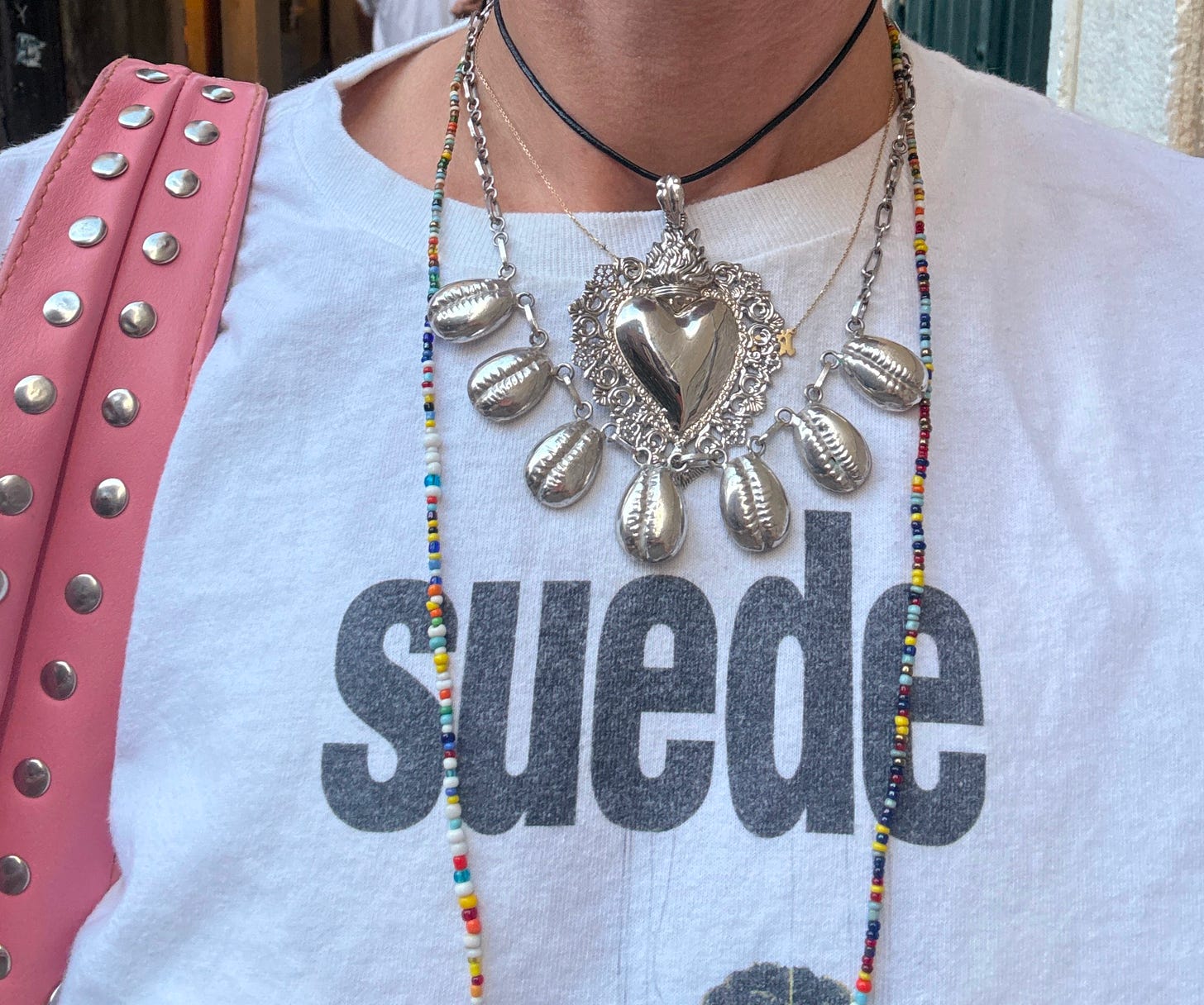 Also in Venice I found this beautiful vintage sterling silver sacred heart pendant at this shop called Luna Creazioni, which was actually two shops down the street from each other run by a mother and daughter team. Each store contained thousands and thousands of pieces of jewelry, mixes of antique and new, from every era. It was heaven? Both mother and daughter are also musicians (piano for the mother, harp for the daughter) and the daughter is a trained gemologist. She polished all my silver because she couldn’t stand the sight of it (my bad). Anyway the flaming sacred heart is a typically Catholic symbol “wherein the heart of Jesus Christ is viewed as a symbol of ‘God's boundless and passionate love for mankind’ ” (that’s from Wikipedia). I’m not Catholic but I like having a tactile reminder of god on my person (I’m pretty sure god is okay with it). In particular, I like jewelry that means something. I saw a note on here once from