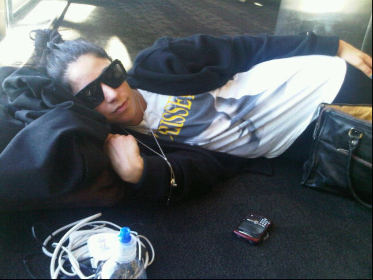 Anyway here’s a picture of me hungover on the floor at LAX in the aforementioned Morrissey shirt with my BLACKBERRY after missing a flight, no idea when this was, maybe 2009? I miss BBM…