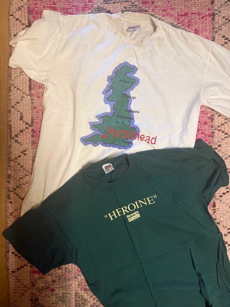 HH: The first concert I ever went to (other than Lollapalooza, which was a safe daytime affair) was Suede/The Cranberries at the Fillmore. I was obsessed with Suede and desperately wanted one of those white t-shirts with the “Animal Nitrate” or “Metal Mickey” cover. I still want one. My friend Leigh, whose brother drove us to the show, had all the best shirts—Suede, a Manic Street Preachers “Gold Against the Soul” long-sleeve. To my dismay, Suede were not selling merch that night. Even worse (for me), everyone seemed to cheer the Cranberries louder than Suede. Anyhow, when they came back for “Dog Man Star,” I bought this “Heroine” shirt even though it says “London Suede” on it—a truly bad name they had to adopt for legal reasons. I think all my friends bought this shirt that night, and my pal Vincent wore it when we were on a public television phone-in telethon for community service. A provocative move, the slight frisson of a quasi-drug reference. That summer, Vince went to England and came back with this enormous Portishead bootleg (?) shirt for me, which I’m glad I kept all these years, as I expanded to its roominess. He also got super into raving and put me onto “Mr Kirk’s Nightmare” (which still scares me).
